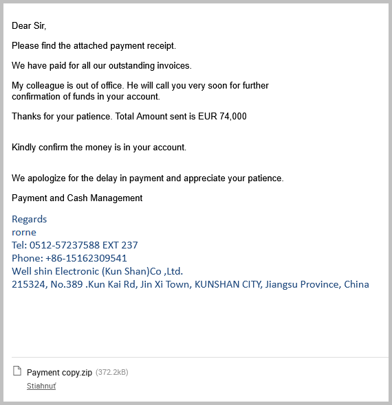 Podvodný email, v .zip súbore je údajne uhradená faktúra na 74000€, ale namiesto nej sme v nej našli len NSIS/Injector.ASH. Email bol zaslaný z adresy interislanddistributors @ gmail[.]com