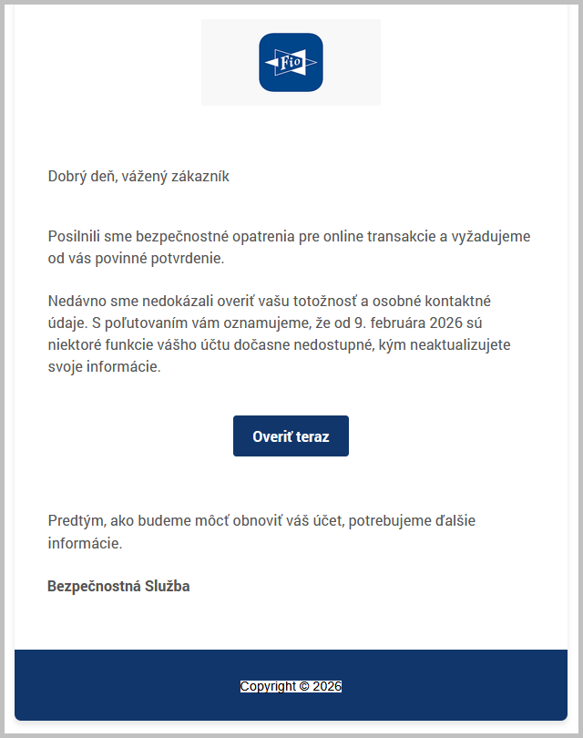 Žiadna banka nikdy od vás nebude vyžadovať overovanie kontaktov a online transakcií takýmto spôsobom, takže email je potrebné označiť za spam a zmazať.