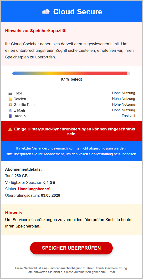 Phishingový email o probléme s nedostatkom voľného miesta v cloudovom úložisku, ktorý sa dá vyriešiť prihlásením do účtu navýšením balíka. Na rozdiel od iných podvodných emailov, tento nežiada priamo platobné údaje, skôr sa snaží ukradnúť prihlasovacie údaje.