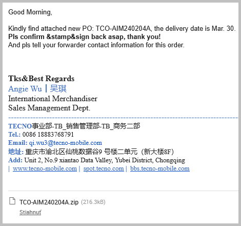 Keď vám príde neznámy email v cudzom jazyku, ktorý obsahu v prílohe .zip súbor, s najväčšou pravdepodobnosťou sa vým niekto snaží doručiť vírus. Konkrétne tento obsahuje škodlivý skript JS/Agent.UGF.